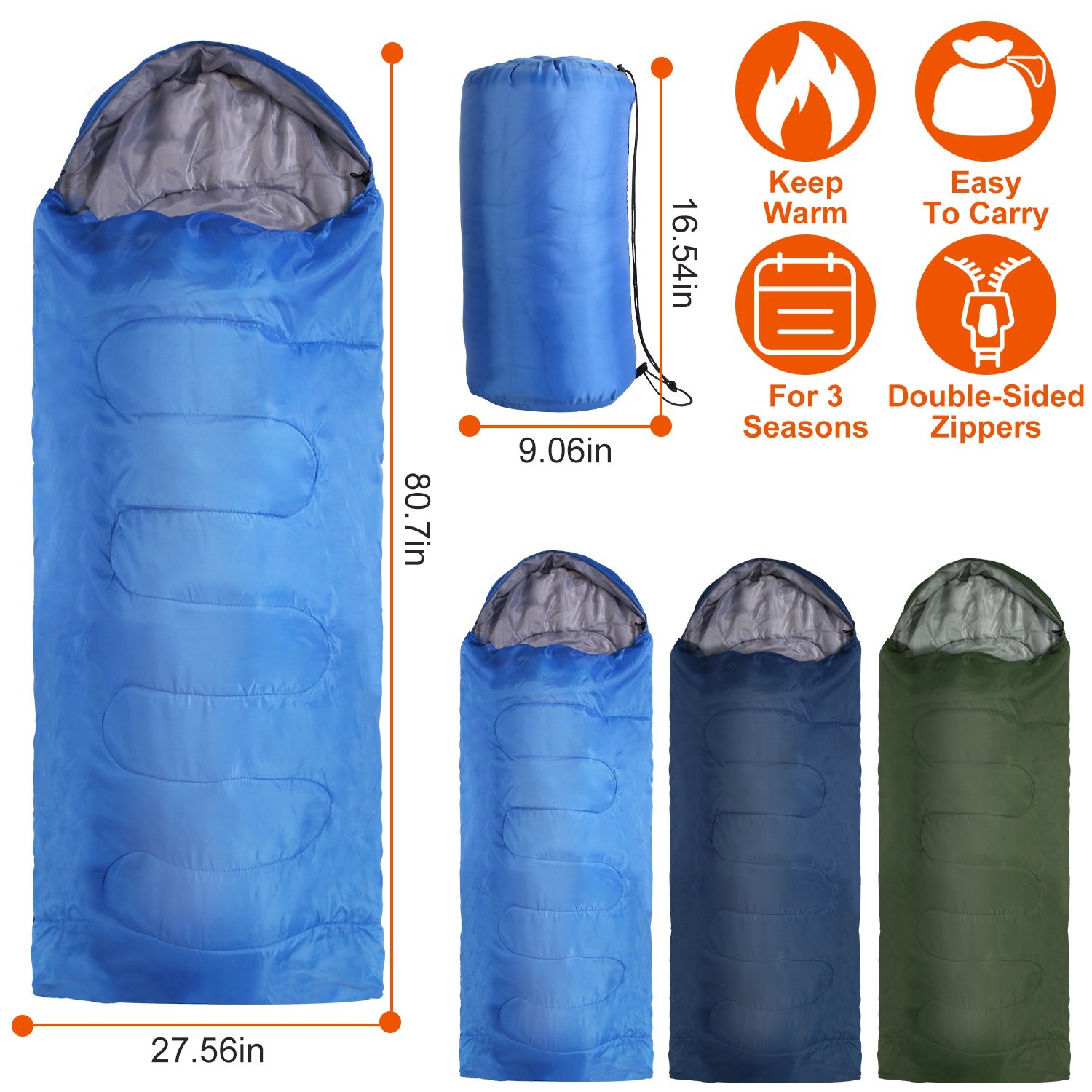 Our sleeping bags are designed to provide you a warm and cozy sleep in cold damp night after a tiring day of outdoor exploration. Its comfortable temperature is at 50℉, great for 3 seasons use(Spring, Autumn, Winter). Made of 170 polyester lining and filled with soft hollow cotton, the sleeping bag is warm and lightweight. Included carry bag makes it quite convenient to store and carry. No more lugging around excessive weight in your backpack. After unzip the sleeping bag, you can also use it as a large quilt or mat. Perfect for hiking, camping, mountaining, etc.. Besides, sleeping bag of navy blue, army green and royal blue are provided for you to choose.